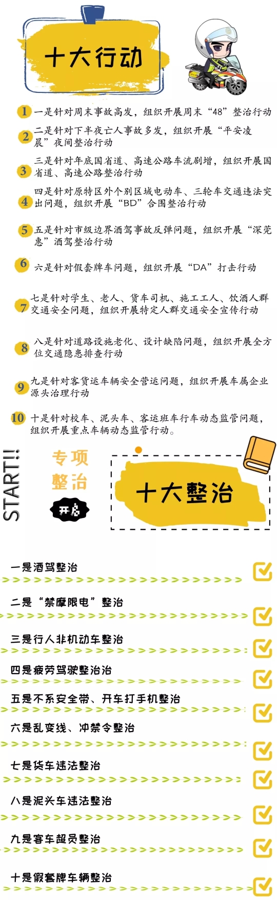 根据目前我市多发的交通事故亡人交通事故类型,结合“百日安全整治”行动,深圳交警将重点开展专项整治行动。全警出动,对查获的各项违法行为进行严格处理。