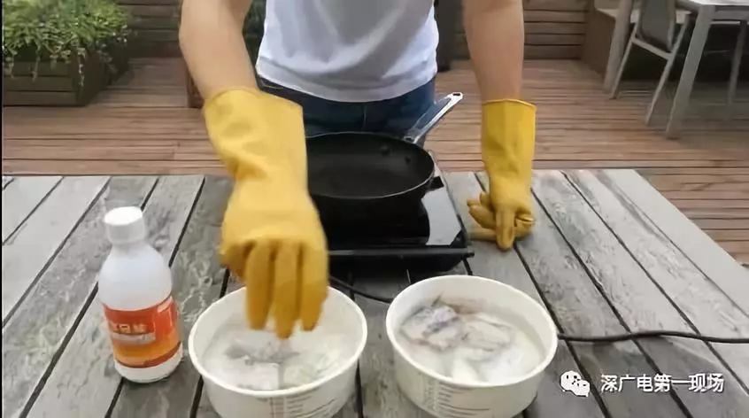第二步,在其中一份带鱼中,倒入少量福尔马林,并浸泡5分钟左右;