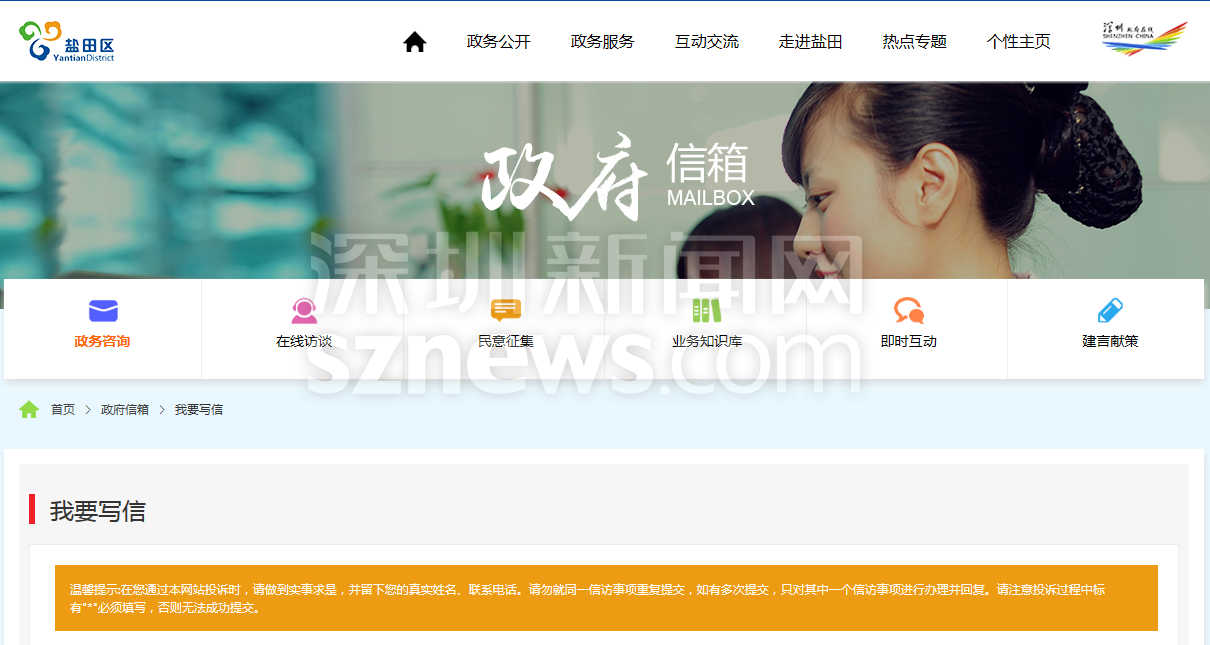 记者通过盐田政府在线网站的信访渠道写信反馈情况,显示提交成功