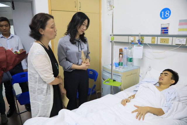 ▲深圳晚报、深圳市红十字会、深圳市关爱行动公益基金会等单位领导和工作人员看望病中的向金华。