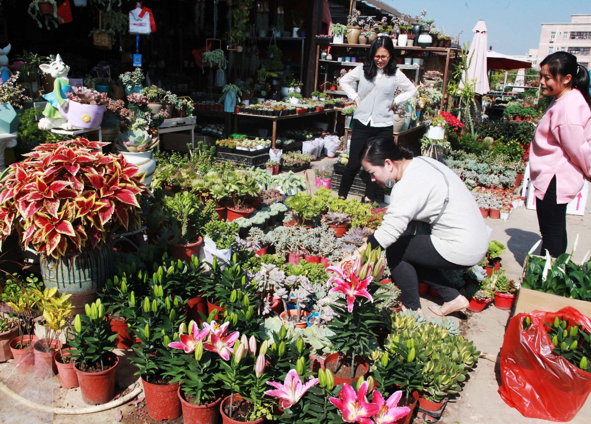 图为市民们逛花市选购盆景、商户忙碌着备足鲜花迎接双节的到来。
