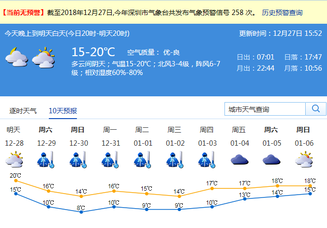记者从深圳市气象局了解到,27日晚上到28日白天(今日20时-明天20时)气温在15-20℃,空气质量优-良,深圳市以多云间阴为主天;北风3-4级,阵风6-7级;相对湿度60%-80%。