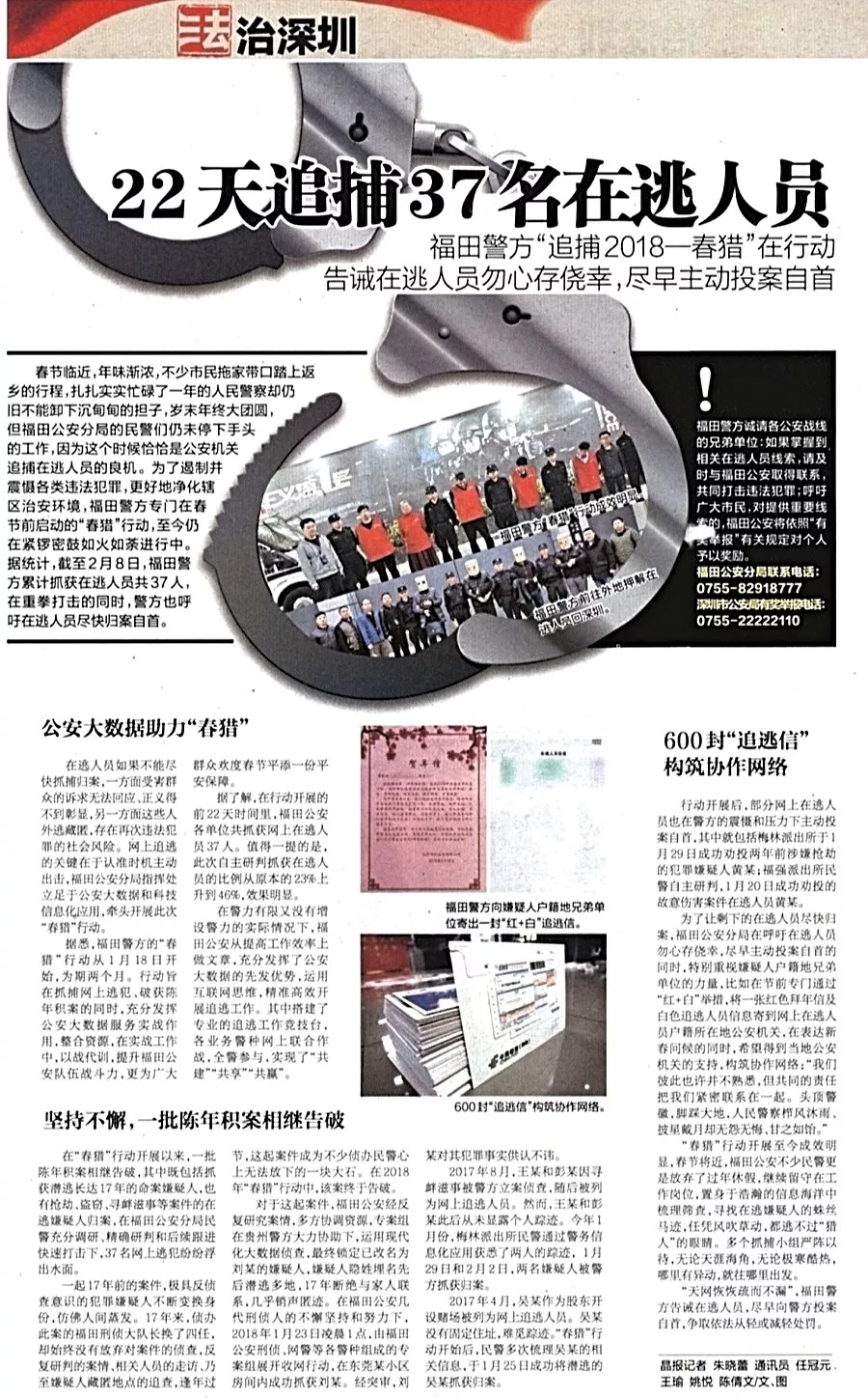 ★★春节临近,万家团圆,福田公安分局的民警却更忙了。他们为了遏制震慑各类违法犯罪,净化辖区治安环境,专门在春节前启动“春猎”行动,剑指负案在逃的犯罪嫌疑人,行动截止2月8日,警方累计抓获在逃人员37人。
