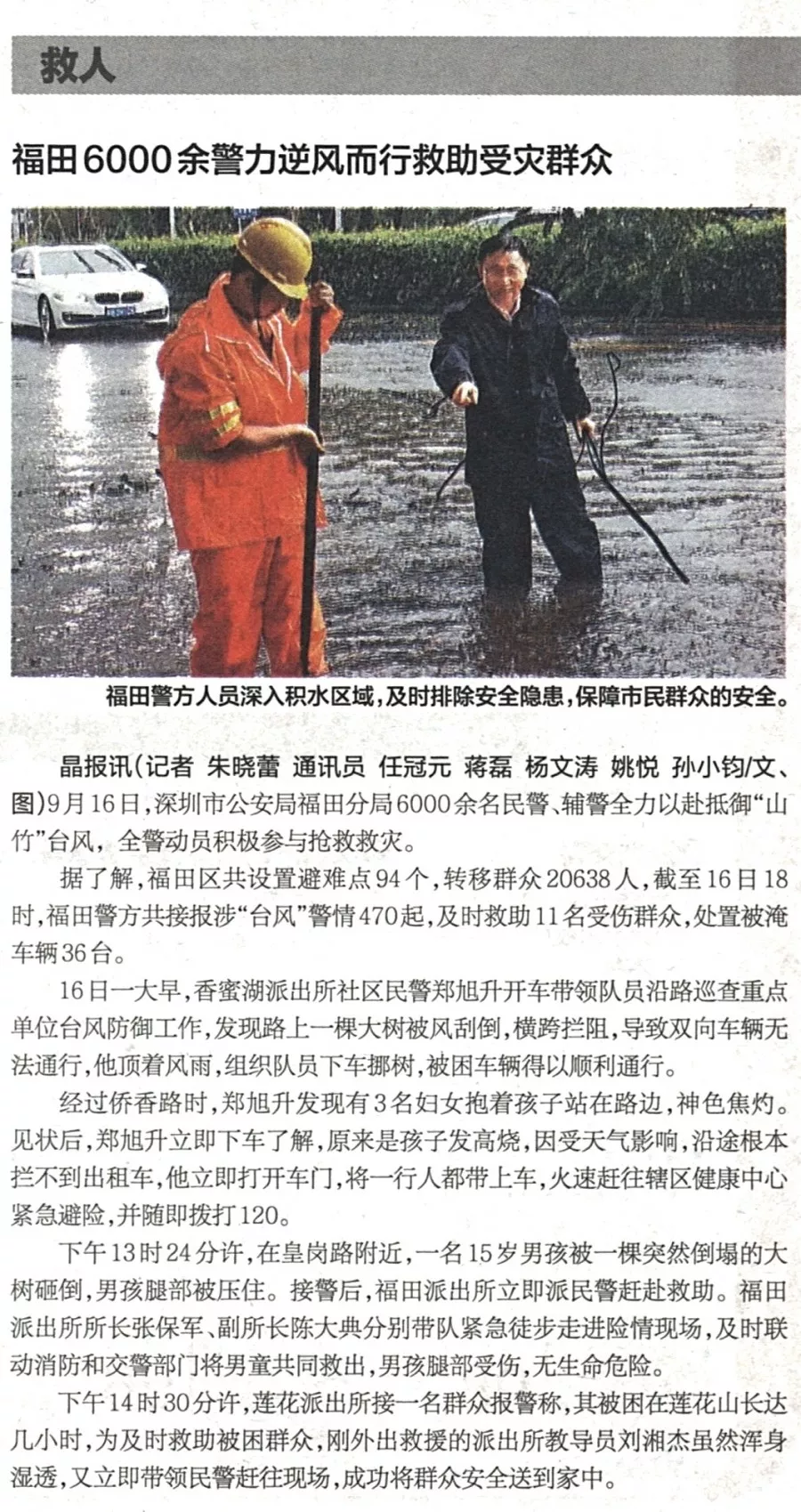 ★★福田警方启动一级勤务,全力投入防御超强台风“山竹”行动中。福田警方共接报涉“台风”警情470起,及时救助11名受伤群众,转移群众20638人,处置被淹车辆36台,确保了辖区治安稳定。