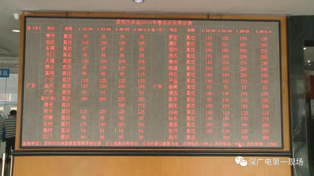 在车站售票厅的票价显示屏,不停地滚动春运期间车站所有线路的票价,均比平时的票价有所上浮,但均在上限票价之内。