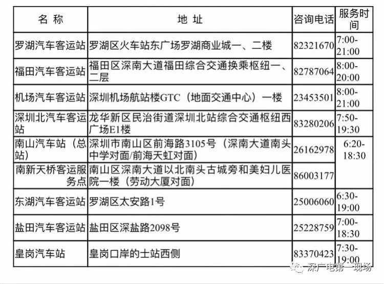 深圳市客货运输服务中心有限公司所属罗湖、福田、南山、东湖、盐田、皇岗、机场、深圳北等汽车站及所属客运服务点将于1月5日起全面预售2019年春运的汽车票。旅客可通过微信公众号“深圳汽车客运”、网站www.88895000.com等渠道查询、订购票。