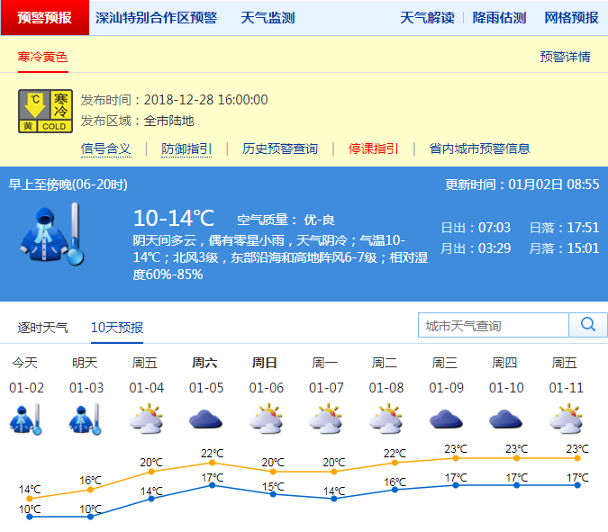 深圳新闻网2019年1月2日讯(记者 陈婕)记者从深圳市气象局了解到,2日有分散小雨;9-13℃;北风3级,东部沿海和高地阵风6-7级;湿度60%-85%。预计3日持续阴冷;4-5日阴天间多云,偶有零星小雨,最低气温明显回升;6日起多云到晴天,气温小幅波动。