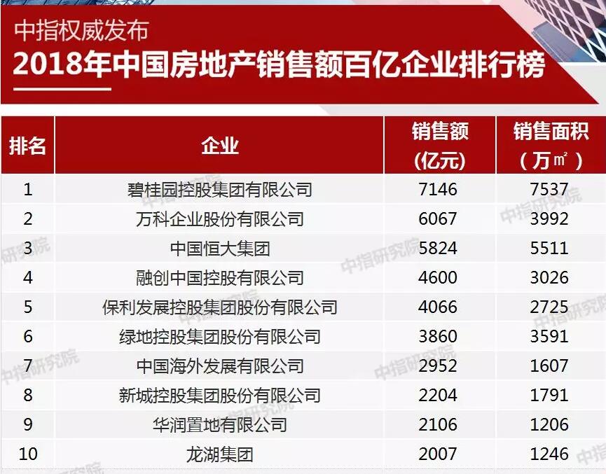 2018年房企销售百亿榜发布:万科、恒大位列第二、第三