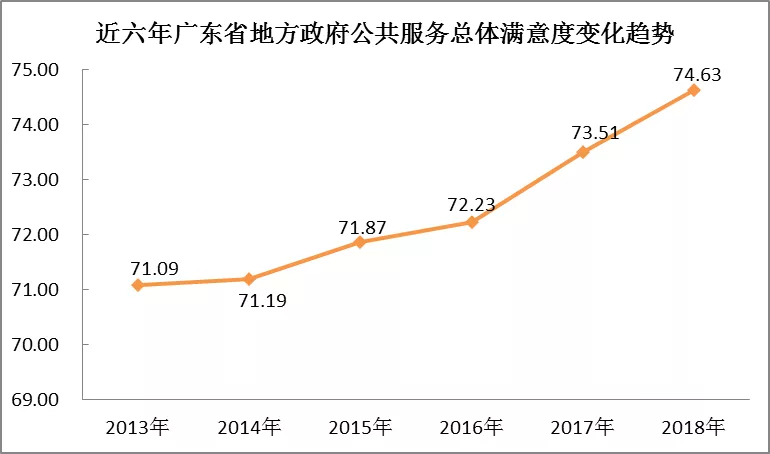 深圳新闻网2019年1月3日讯 近日,广东省省情调查研究中心、广东省社会科学院绩效评估中心公布了《2018年广东省地方服务型政府建设系列调研报告》(以下简称“报告”),今年该调研根据“公共服务”和“营商环境”双向维度,由“广东省地方政府公共服务公众评价调查”和“广东省营商环境公众满意度调查”两个调查组成。今年调查共回收有效问卷28156份,结果显示:2018年广东省地方政府公共服务总体满意度得分为74.63分,较去年提高1.12分,创十年来最高水平。