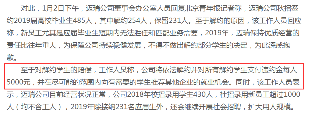 2019年1月2日,迈瑞负责人回应:秋招签约485人中解约254人,会支付违约金
