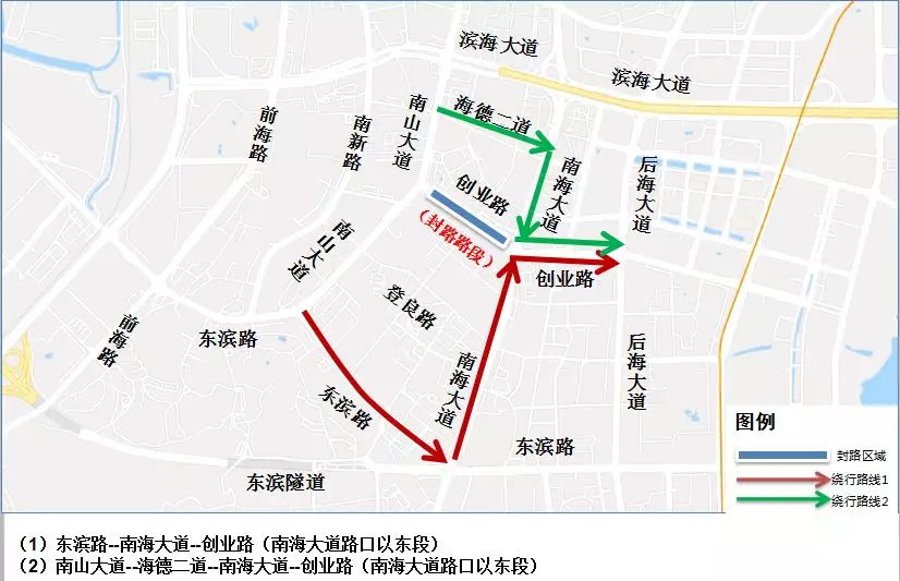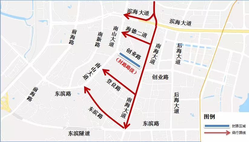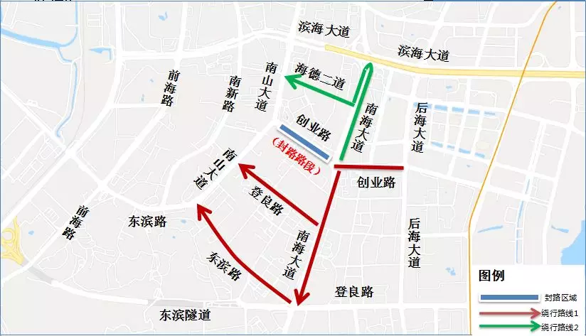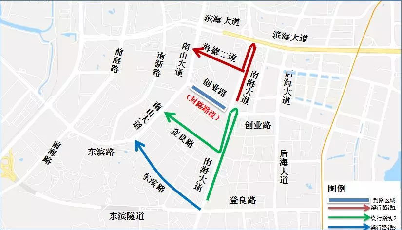 原经南山大道转入创业路东行,前往南海大道北行的车辆,可改沿南山大道北行,或经东滨路转入南海大道北行。