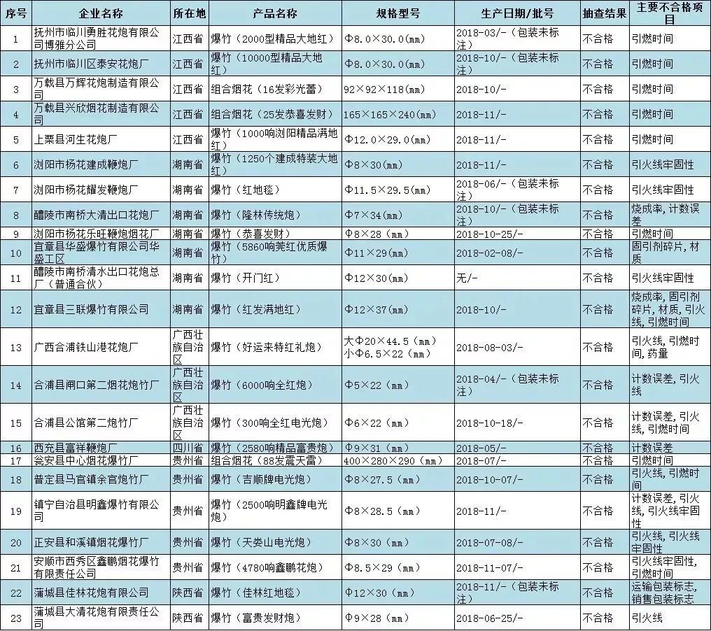 ③国家市场监管总局日前组织开展烟花爆竹产品质量国家监督专项抽查,共抽查6个省(自治区)150家企业生产的150批次产品,检出23批次不合格,不合格发现率为15.3%。