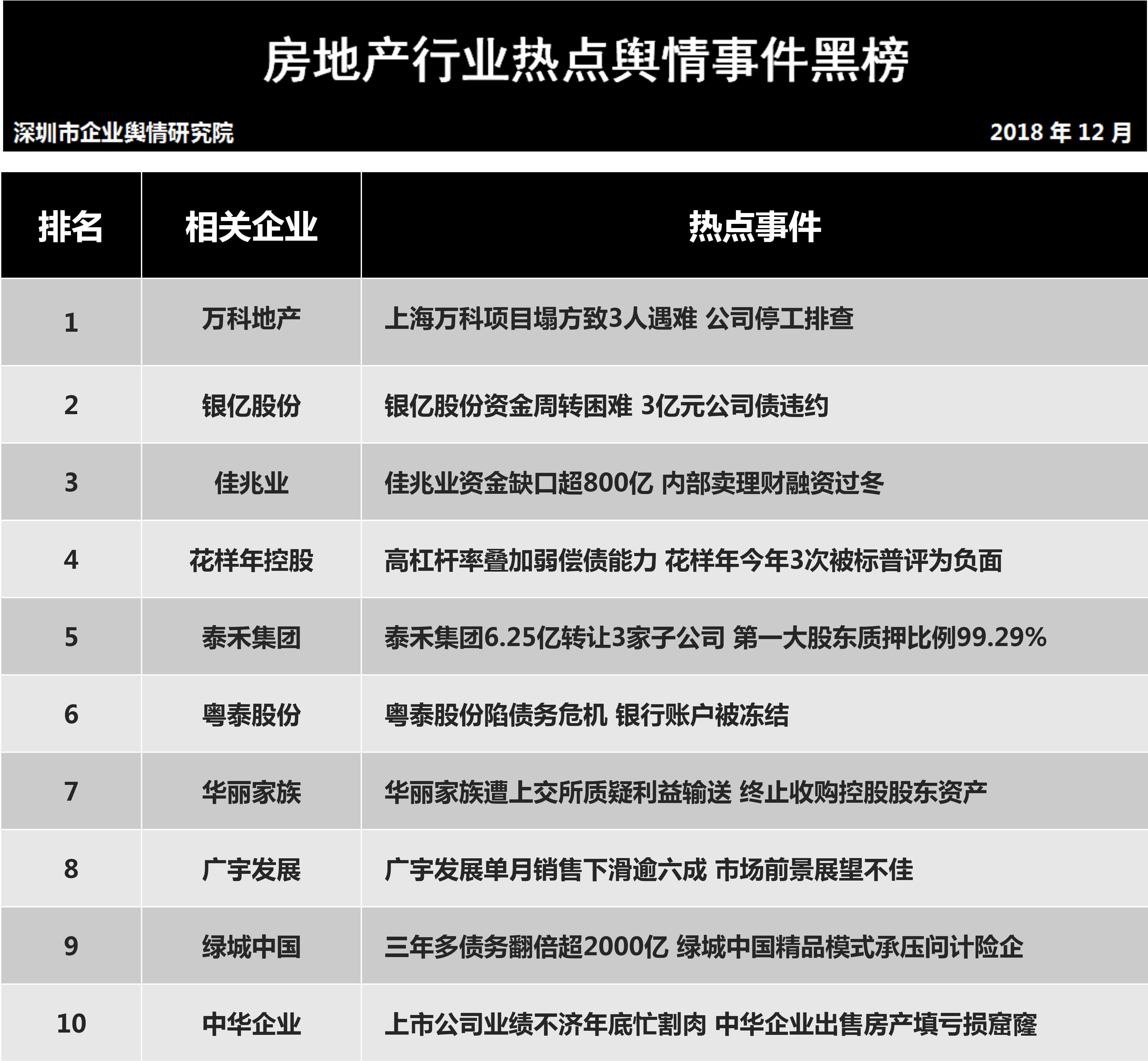 深圳新闻网2019年1月7日讯 (记者田志强 通讯员陈文光)1月7日,深圳企业舆情研究院发布第十一批企业舆情榜单。本次榜单重点聚焦房地产及医药保健两个行业。房地产行业企业舆情榜单由房地产行业热点舆情事件排行榜(红、黑榜)及房地产企业公众形象排行榜组成。