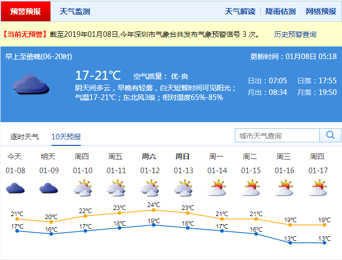 深圳市气象局预计,8日阴天间多云,早晚有轻雾,短暂时间可见阳光;气温15-20℃;东北风3级;相对湿度65%-85% 。9-10日阴天间多云,偶有零星小雨,短暂时间可见阳光;11-14日多云间阴天,可见阳光,天气温暖,早晚能见度较差。