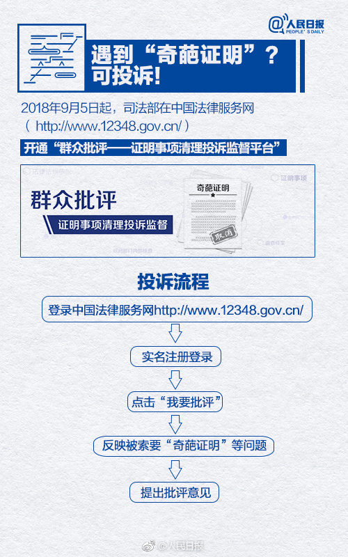遇到这样的"奇葩证明"可在司法部开通的网上投诉平台上进行投诉,实名登录后即可反映意见,各地方被要求在15天内反馈。