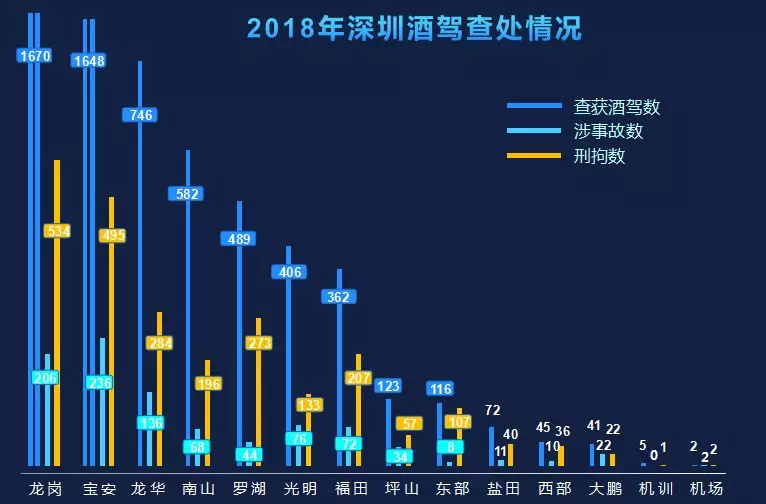 2018年深圳交警共受理危险驾驶案6687宗,立案6307宗6313人,处置醉酒驾驶6313人,全部采取了刑事强制措施。涉及酒驾事故925宗,占总数的14.65%。此外,2018年办理阻碍执法案85宗89人,行政拘留74人,教育警告15人;办理妨害公务案7宗,刑事拘留7人。