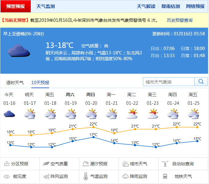 深圳新闻网2019年1月16日讯(记者 陈婕)记者从深圳市气象局了解到,16日受冷空气和切变线影响,阴天有分散小雨,天气显著转凉,沿海和高地阵风6-7级;17-18日多云,可见阳光,早晚较冷;19-20日受偏东气流影响,阴天间多云,间中有分散小雨。21日阴天有小雨转多云,气温下降;22日起天气晴朗干燥。