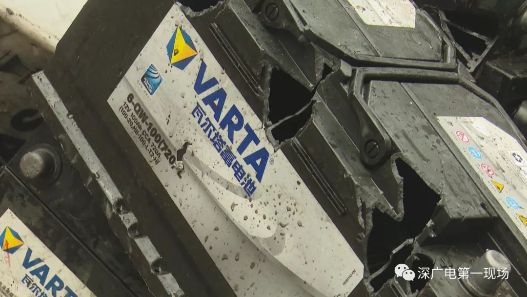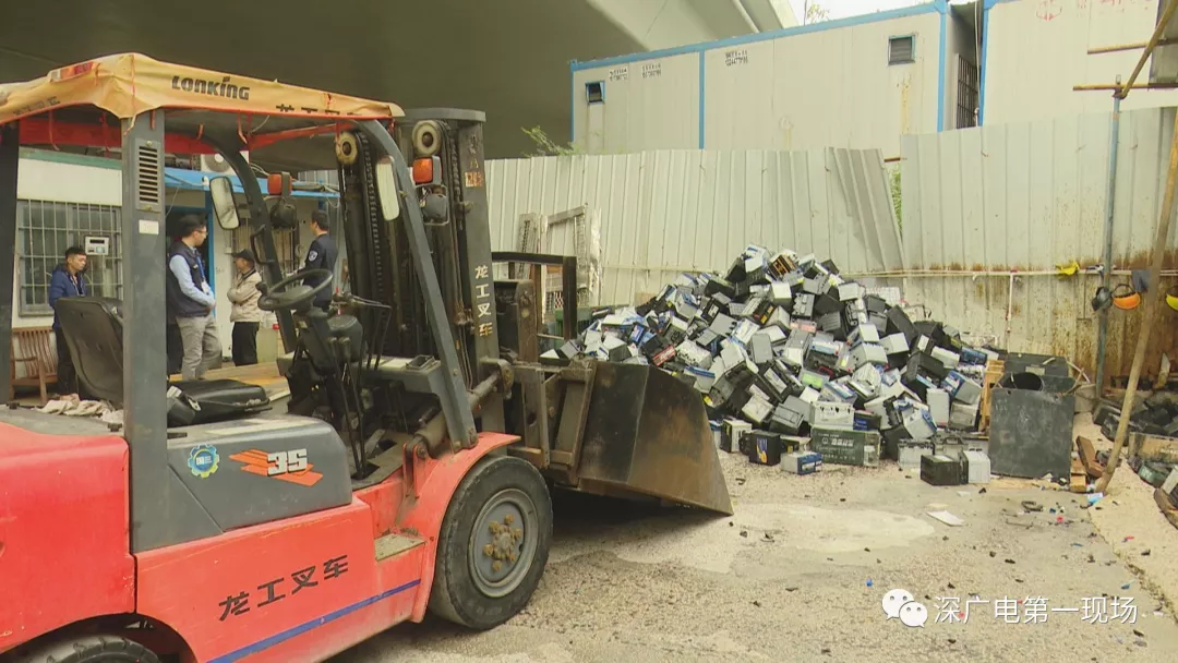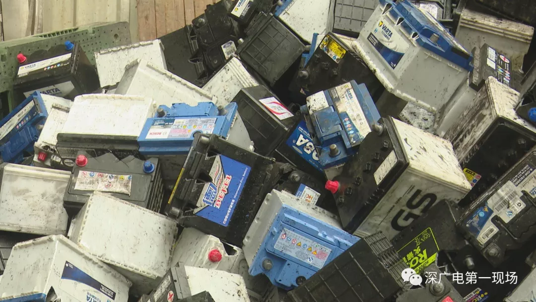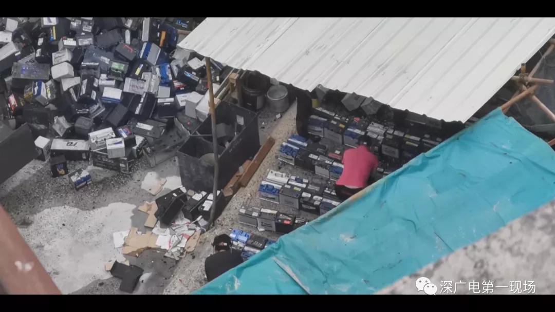 这是昨天下午2点多,记者跟随南山区环保水务执法人员,到现场查处时看到的情形。一处近500平米废品回收场站内,废旧电池堆积如山。