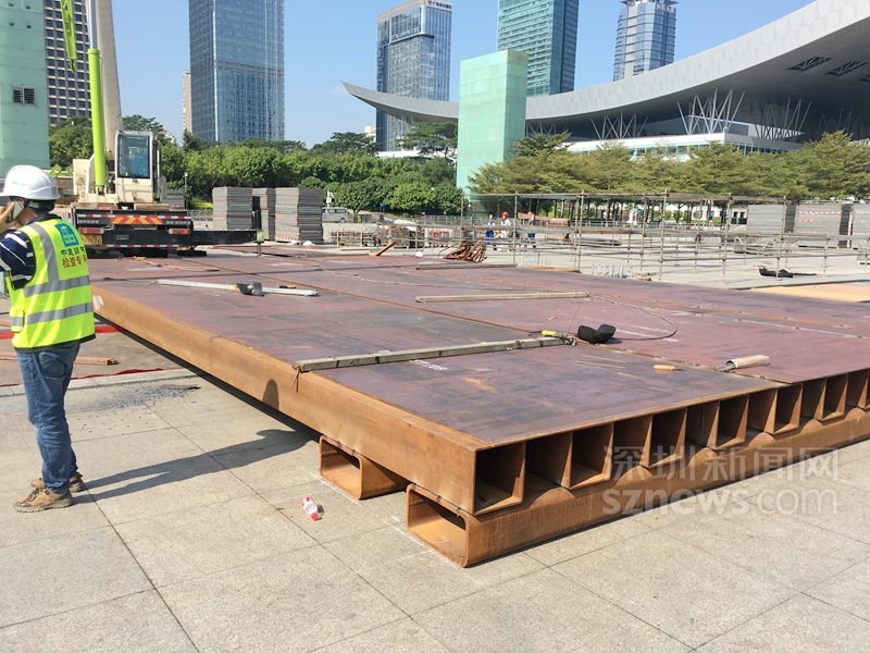 在市民中心南广场搭建春晚深圳分会场舞台,借助深圳灯光秀为背景,确实是一个绝佳的创意。要实现创意,搭建舞台是关键一役。去过南广场看灯光秀的深圳人应该知道,南广场中间位置正好是地下车库的玻璃采光棚,春晚主舞台刚好就位于广场玻璃采光棚的正上方。玻璃材质决定了它无法承受上部集中荷载,需要事先改变传力路径或对场地下部梁板进行加固处理,谢卫兵和同事发现,研究舞台局部可操作性的加固方案迫在眉睫。