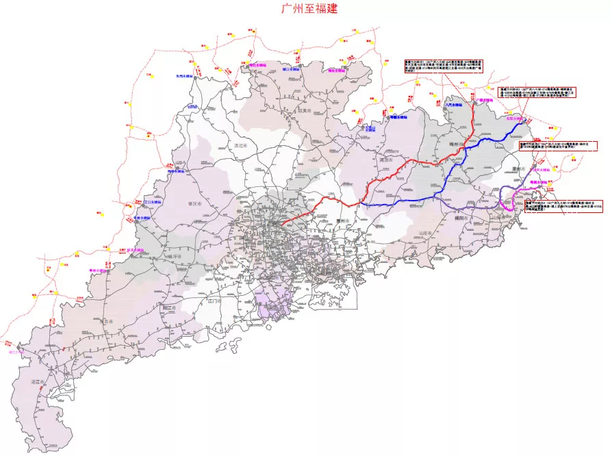 从广州出发,通往湖南、广西东北部、江西、福建、广西北部湾及海南方向的出行指引: