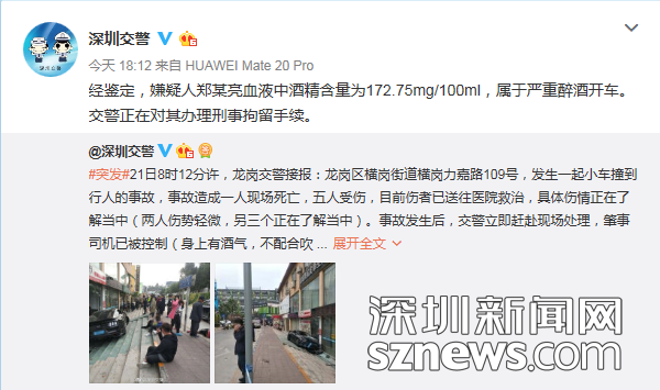 深圳一跑车冲向人行道致1死5伤 肇事司机严重醉驾