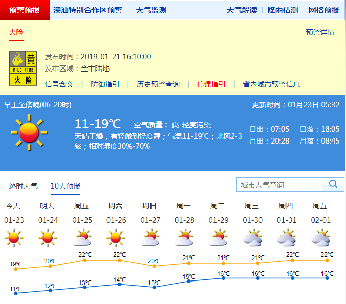 深圳新闻网2019年1月23日讯 深圳今日白天,天气干燥,部分地区能见度较低,有轻微到轻度霾;气温11-19℃;偏北风2-3级;相对湿度30%-70%,湿度低,火险预警生效中。24-27日依然晴天干燥,部分时间有轻微到轻度霾;28日多云,湿度回升。天气持续干燥,日温差大,早晚较冷。