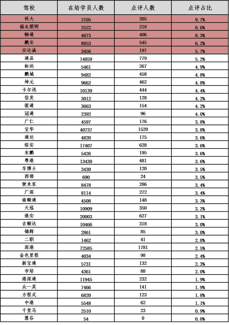 以下对深圳各驾校详细信息进行公布,市民可根据下表,选择人车比和在培待考量相对较低、学车周期较短、投诉率较低、诚信评价等级较高的驾校进行培训: