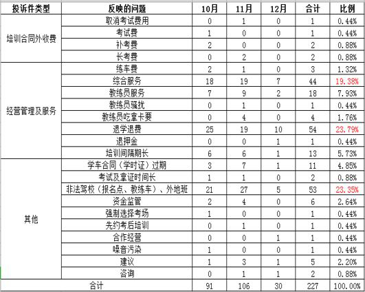 第四季度投诉主要集中在退学退费、非法驾校(报名点、教练车)、外地班等问题。学员与不合规范的驾校、外地班产生的矛盾是本季度产生投诉的主要原因;此外,还有部分学员反映综合服务等问题。