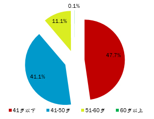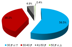 年龄方面,学员平均年龄为29岁,其中30岁以下的有24804人,占比56.5%;30-40岁的有16785人,占比38.2%;41-50岁的有2156人,占比4.9%,50岁以上的有157人,占比0.4%。