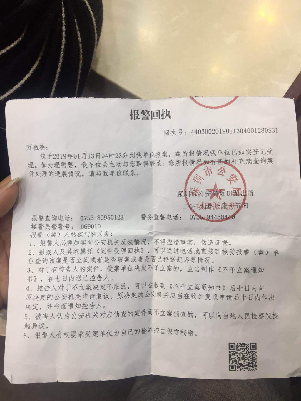 ▲报警回执单