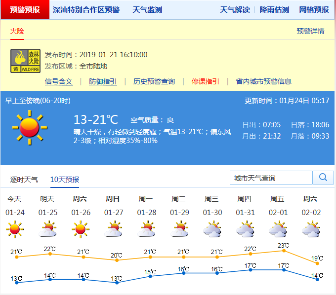 深圳新闻网1月24日讯 今日白天,深圳以晴天干燥天气为主。早晨气温较低,最低气温徘徊在13 ℃左右,中午前后气温略有升高,最高气温在21 ℃左右。