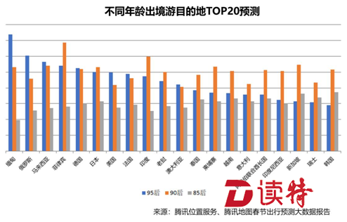 根据年龄划分,18岁以下青少年最喜欢前往东南亚国家,而60岁以上老年人最青睐的是欧美发达国家。进一步研究发现,85后最爱去的国家是韩国、新加坡、瑞士、阿联酋、越南,涵盖东亚、东南亚和欧洲,90后最爱去的国家是菲律宾、印度、新加坡、马来西亚、柬埔寨,全部在东南亚地区,95后最爱去的国家是缅甸、俄罗斯、马来西亚、菲律宾、德国,涵盖东南亚和欧洲。