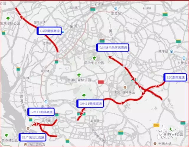 (2)建议行驶在广深高速公路由深圳往虎门方向的车辆,在长安出口、虎门出口绕行国道或转到常虎高速公路前往到广州等地。