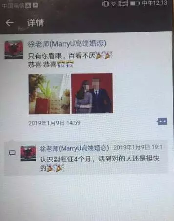 没想到半个月之后,陈先生的朋友发现,他的结婚照出现在了一个婚恋公司员工的朋友圈里。陈先生告诉记者,这个员工转发他的照片同时还在上面评论写上“认识到领证四个月,遇到对的人还是挺快的”。