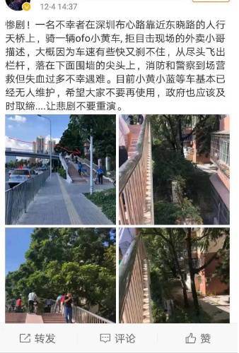 原标题:罗湖一路人骑共享单车飞落天桥坠亡,深圳交警公布事故原因