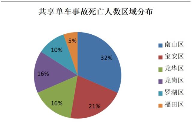 从事故行政区分布来看,南山区发生的共享单车事故死亡人数最多,死亡6人、占比约为32%,其次为宝安区、死亡4人、占比21%。