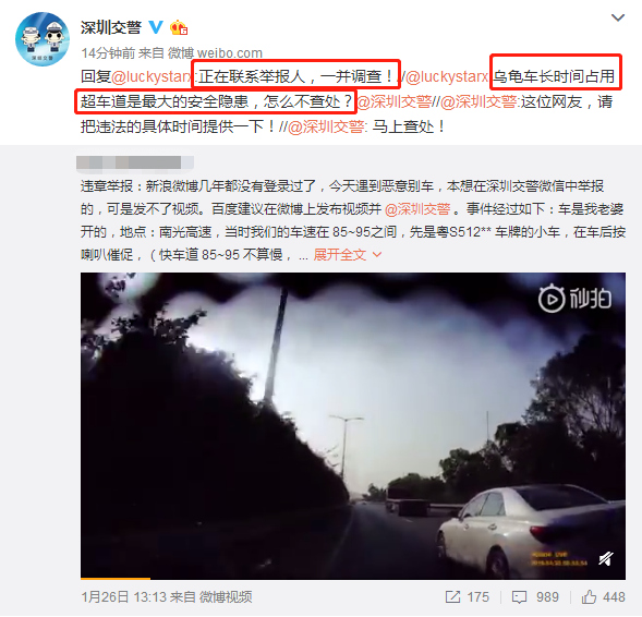 1月28日下午5点,深圳交警在微博上也给网友作出回复,对于长时间龟速占用超车道的行为也将一并调查。