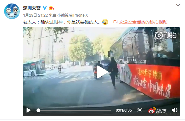 深圳zaker2019年1月31日讯 1月29日,深圳交警微博发布了一段视频,并配文"老太太:确认过眼神,你是我要碰的人。"