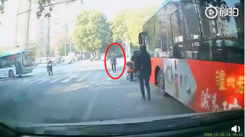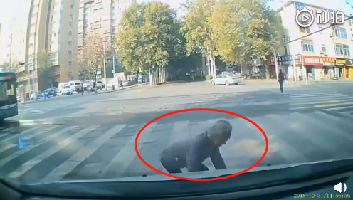老太太走到小车正前方时却突然停下脚步,紧接着缓缓卧倒在地。