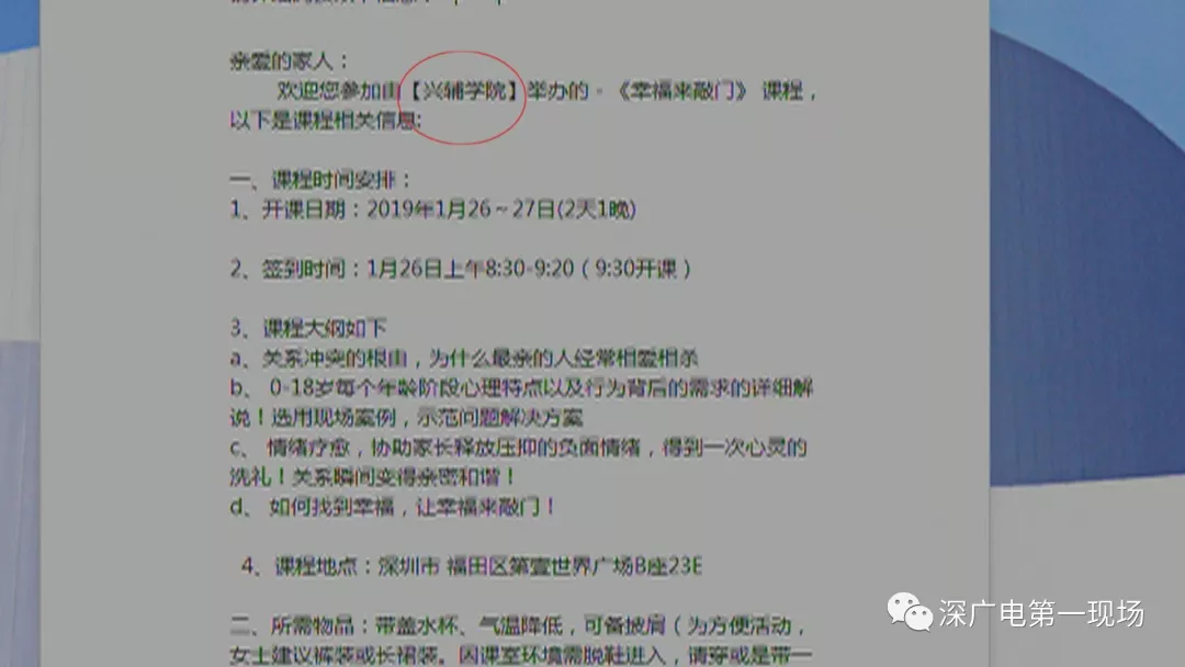 深广电第一现场2019年2月1日讯 寒假前夕,龙华区不少家长向我们栏目反映,从上学期开始他们通过学校老师的介绍,接触到了一个教育机构。这个校外的培训机构,主要给家长传授亲子教育和家庭相处的技巧,按说这应该是一件好事,可是一些家长却发现,参加了一些课程之后,不光家庭关系没有变好,反而带来了不少家庭矛盾?