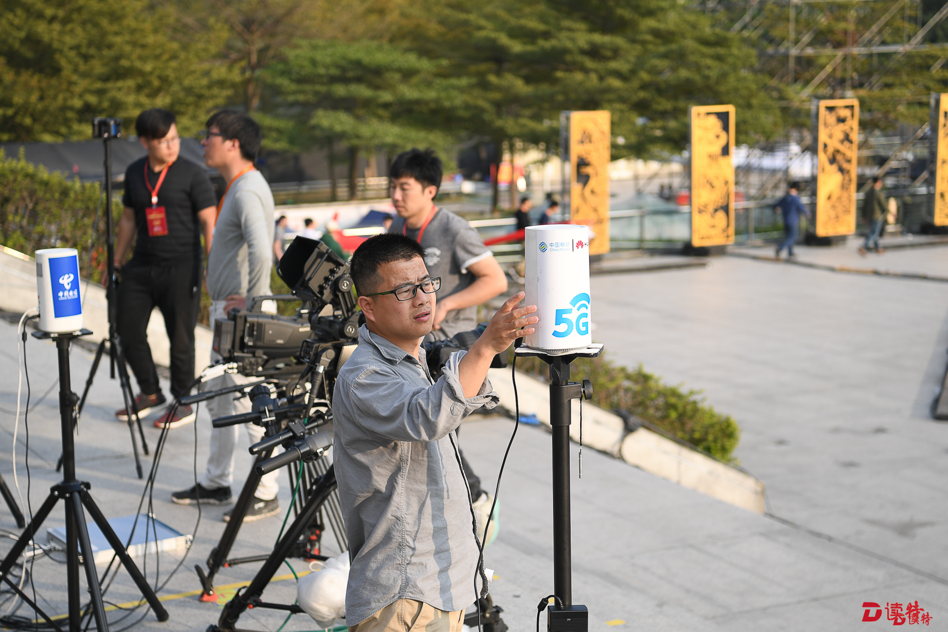 在市民中心广场,央视的5G网络VR实时制作团队连日来已经在反复调试设备。记者看到,他们的设备相当简单便捷,包括有6个镜头的全景摄像头和5G网络接入终端,工作人员手持两台笔记本电脑用于现场VR视频的缝合,从而实现VR超高清视频通过5G网络的制作和回传。