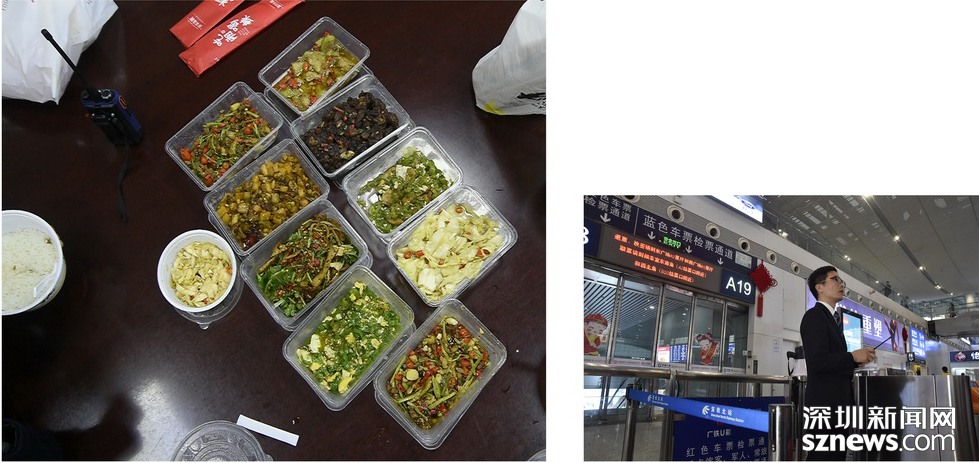 春运第一天,人流如织。从下午2点半上班开始,聂新强忙了5个钟头,安全送走大约20万人。晚上七点半,在各闸机口顶替了五位同事吃晚饭之后,聂新强终于吃上了“豪华”外卖“快餐”,“豪”的是一人独享八人份,“快”的是只用了10分钟不到就结束了战斗。