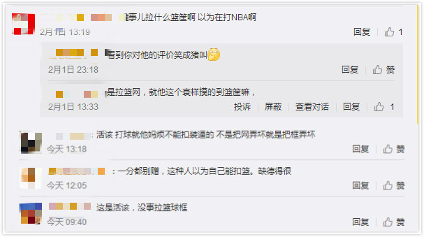 还有一些网友借机表达了自己对某类人的"墙裂"不满!"没事儿拉什么球框啊,以为在打 NBA啊""活该,打球就烦不能扣还装 X的"......