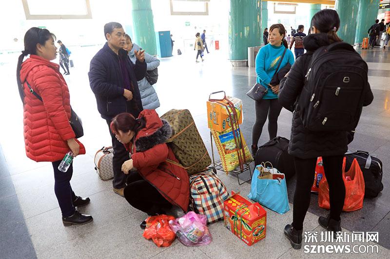 不少旅客携带当地水果以及家乡特产返回深圳,图中这一家人下车后整理行李