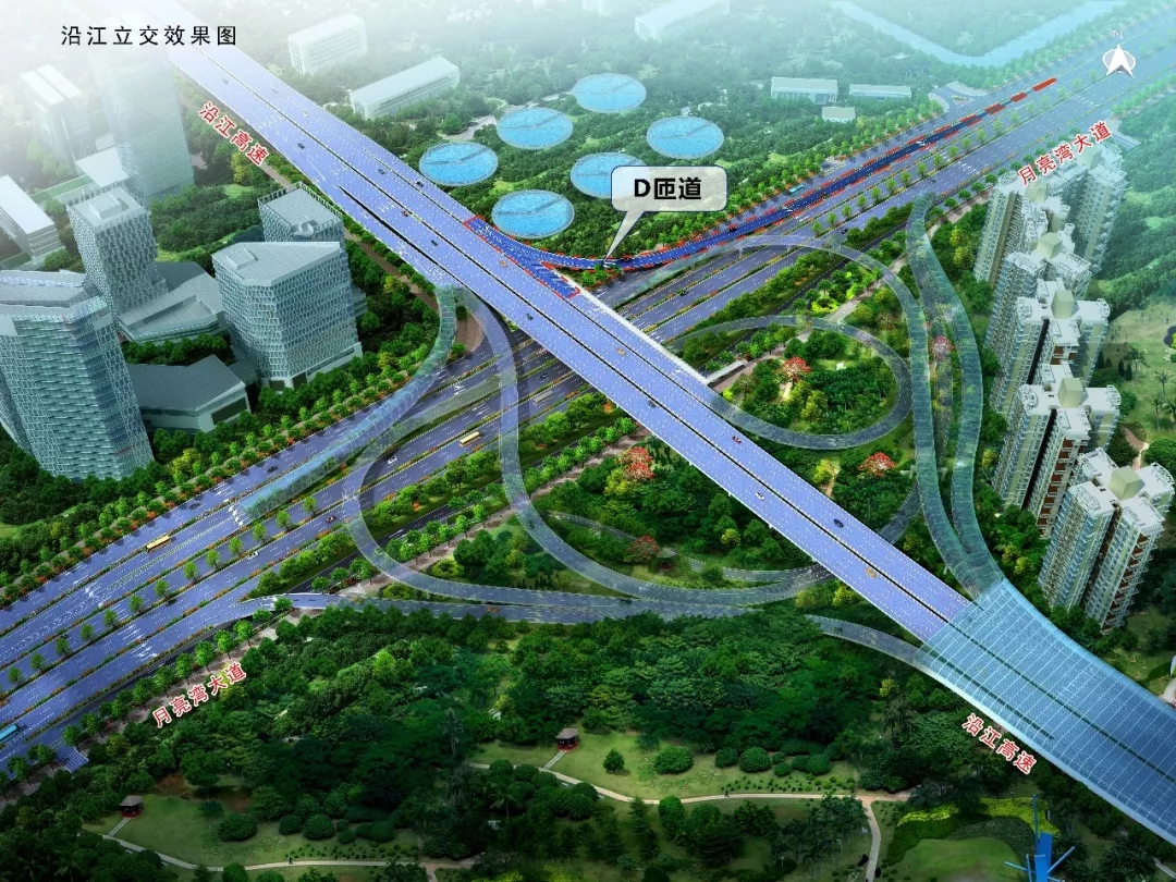 建成后车辆沿月亮湾大道南行可通过D匝道直接进入沿江高速往广州方向行驶。