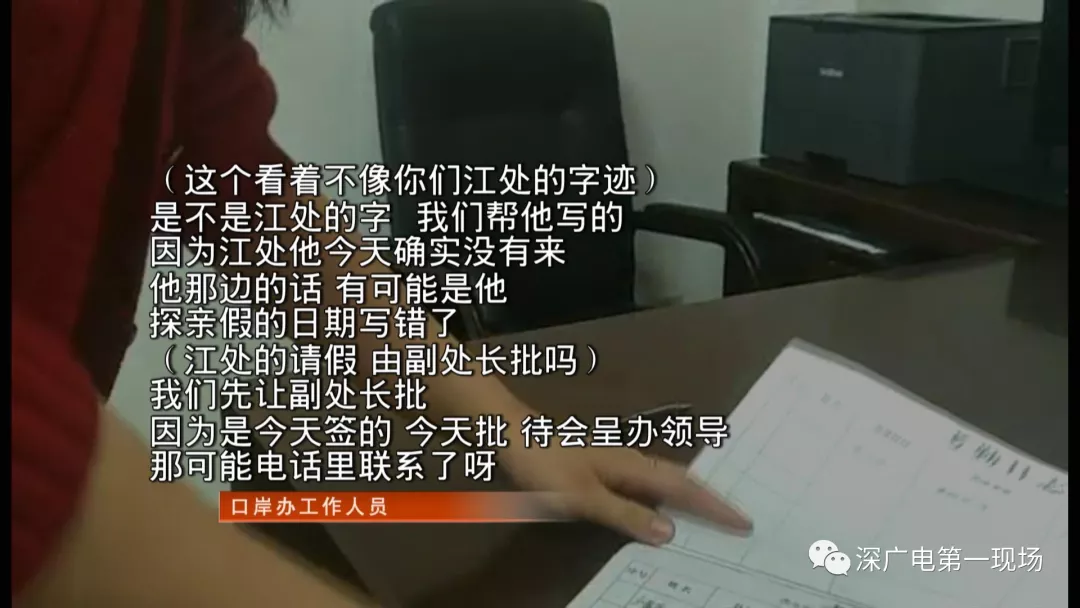 但暗访发现,也有个别缺岗人员未按照正常流程履行报假手续。2月11号上午9点40分,市纪委暗访组来到深圳市口岸办公室,发现该单位到岗率良好,办公秩序井然。但在暗访检查中发现,本应登记当天在办公室上班的口岸办陆路二处处长江某并不在办公室,经核对其请休假情况,其提交的休假报告是从2月12号开始,但11号,他人已经没有到岗。随后,该处一名工作人员拿出了一份登记表,表上写名该处长今天补休。然而,领导签字一栏并非单位主管或分管领导,而是该处的一名副处长。暗访人员发现这份登记表是11号当天才填写的。