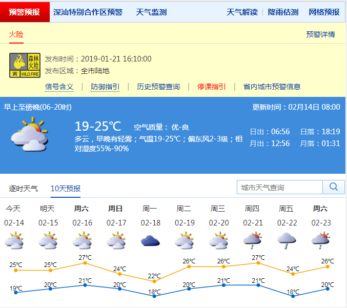记者从深圳市气象局了解到,14日深圳全市多云为主,气温19-25℃,相对湿度70%-90%,偏东风2-3级,能见度8-18公里。值得一提的是,今天距离深圳平均入冬日:1月13日已经过去一个月了,今年直接入夏的可能性越来越大。