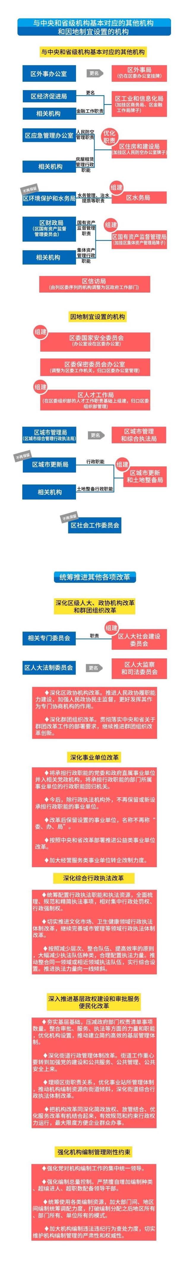 本次区级机构改革,总的要求是中央及省明确的改革任务要坚决落实到位,主要机构设置同省、市保持基本对应。同时,又充分体现地方机构综合设置的特色,以推进党政机构职能优化协同高效为着力点,改革机构设置,优化职能配置,深化转职能、转方式、转作风,提高效率效能,积极构建系统完备、科学规范、运行高效的机构职能体系,构建简约高效的基层管理体制。