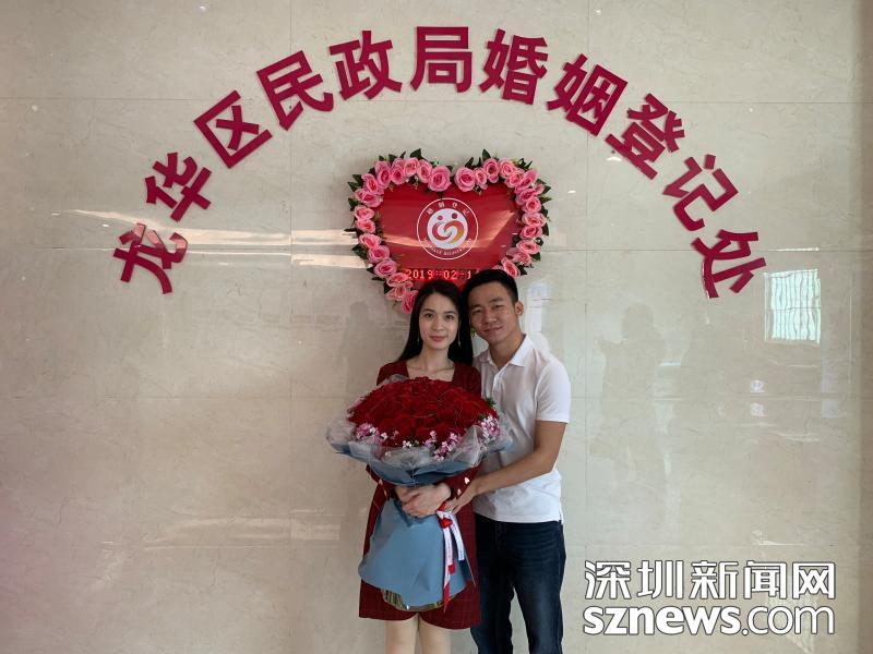 身穿红色连衣裙,手上捧着99朵玫瑰花,25岁的曾林雪脸上洋溢着幸福的笑容,她和丈夫刘家勇在龙华区婚姻登记处拍照。“2月13日,我老公跟我求婚,一个浪漫又意外的求婚仪式,让我特别感动。2月14日是情人节,我们领证结婚,两天连起来刚好是‘1314一生一世’。”曾林雪告诉记者,她在龙华当老师,刘家勇在龙华做城管,两人是在刘家勇巡逻时认识的。“我们在龙华婚姻登记处还参加了简单庄重的结婚仪式,我们在国徽下庄严宣誓,最为感动的就是听到我老公说‘一生一世守护我’。”曾林雪说,婚后他们将在暑假期间到杭州度蜜月,今年生个猪宝宝。