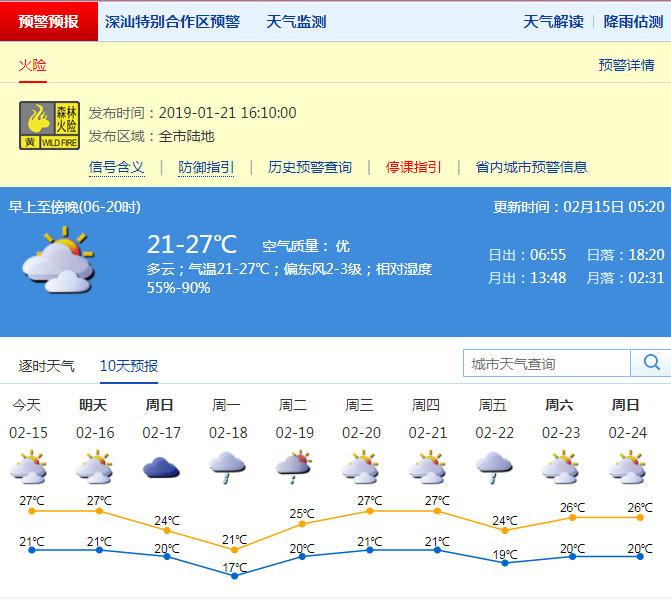 市气象局预计,15-16日深圳市可见阳光,温暖湿润早晚有(轻)雾,气温在20-28℃;17-18日天气转凉,沿海及高地阵风可达8级;18日有小到中雨;19日小雨转多云。请市民注意关注低能见度和大风对交通和户外作业安全的影响。